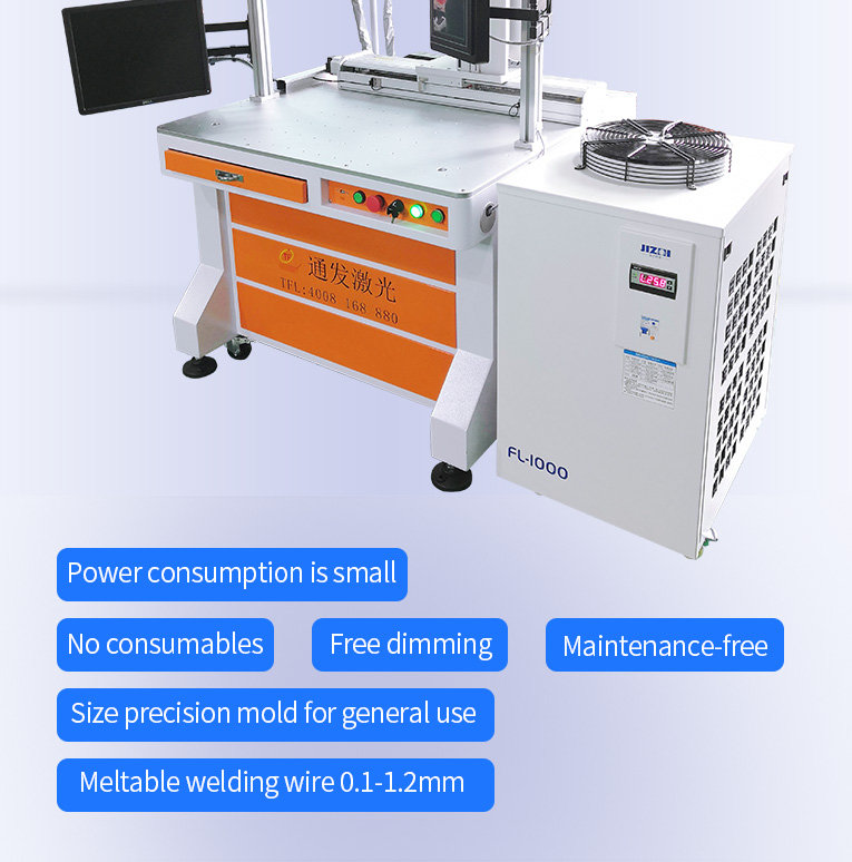 1. The use of fiber laser, high reflectivity, strong energy, maintenance free, light free, less power consumption, compared to the traditional mold welding, small size, safety, good stability and long service life.